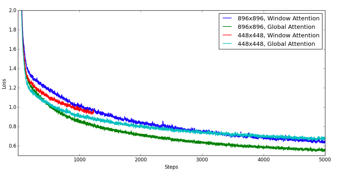 Training Loss的话肯定是越高分辨率的图像输入效果越好, 但是Window Attention不如Global Attention: